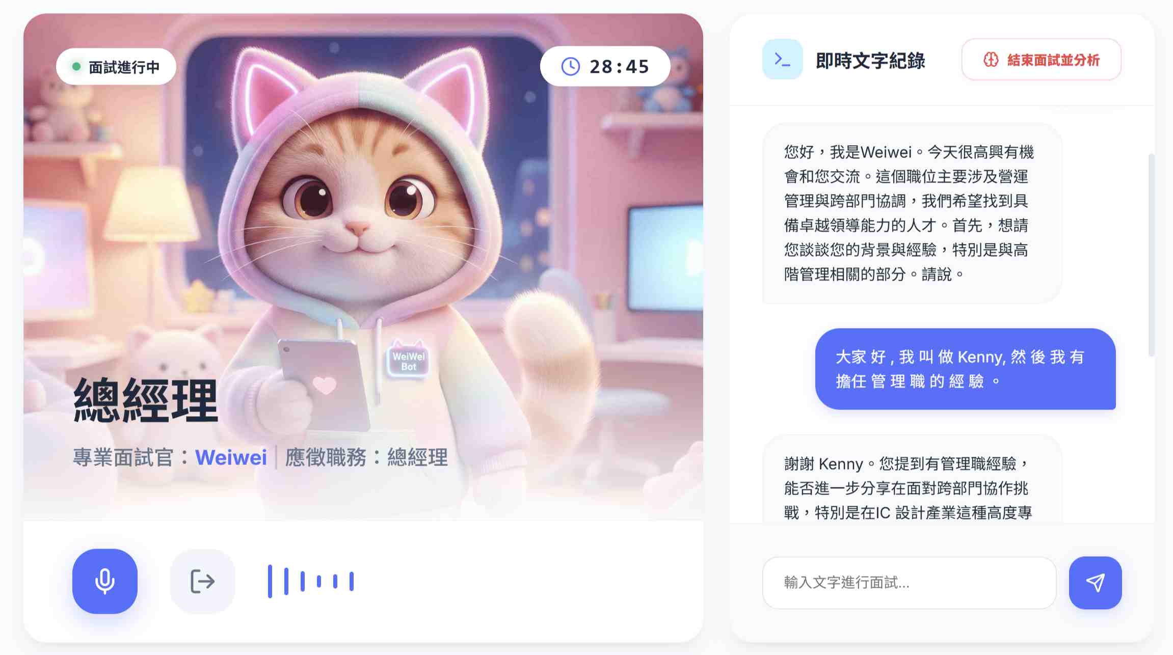 針對目標職位與 AI 面試官進行模擬面試,AI 會評分並提供改進建議,不再面試尬聊。