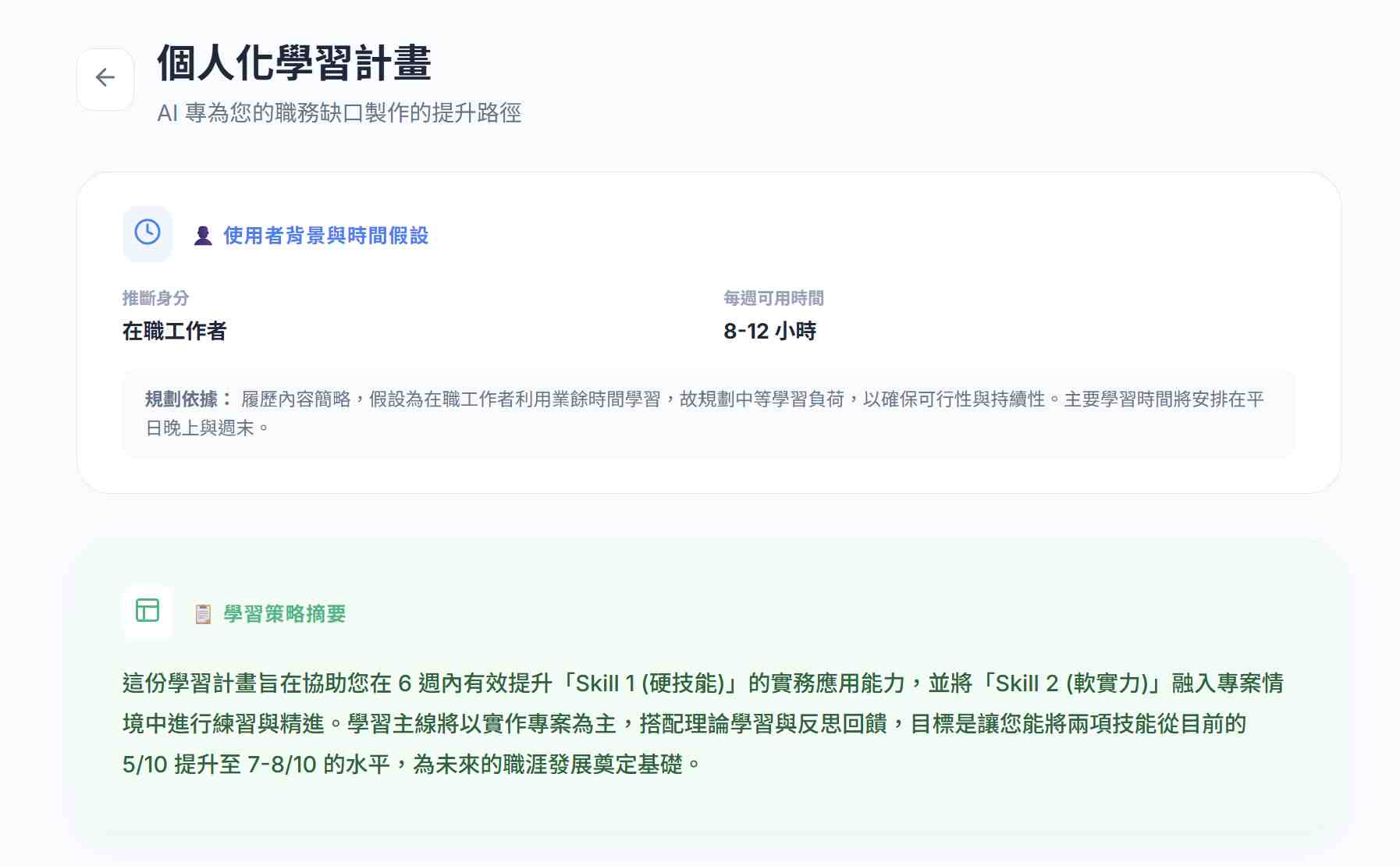 為了確保學習計畫的聚焦度與系統資源分配,每份履歷分析報告只能進行「一次」職務能力落差分析並生成一次計畫。請務必在 Step 2 認真填寫您的技能熟悉度喔!
